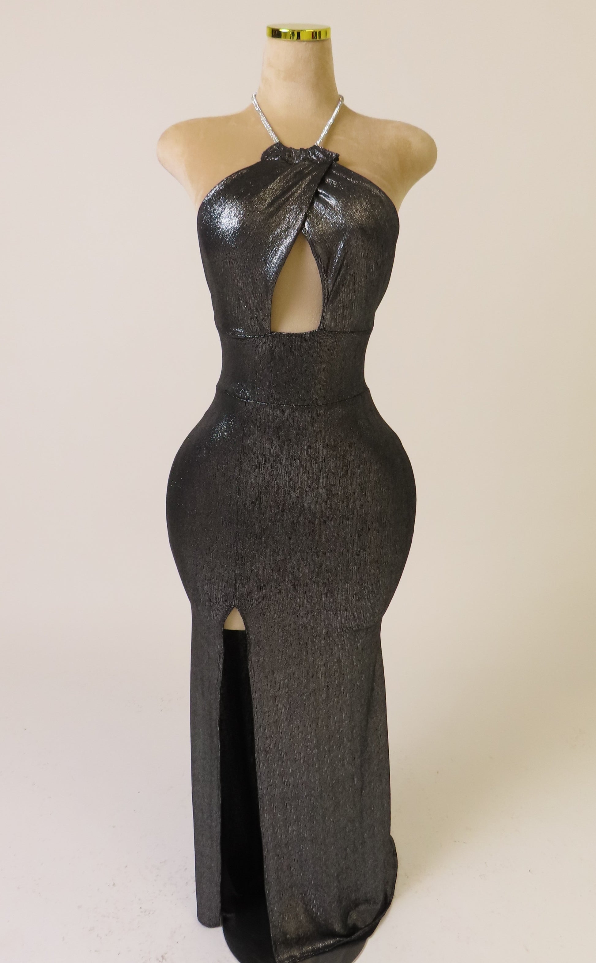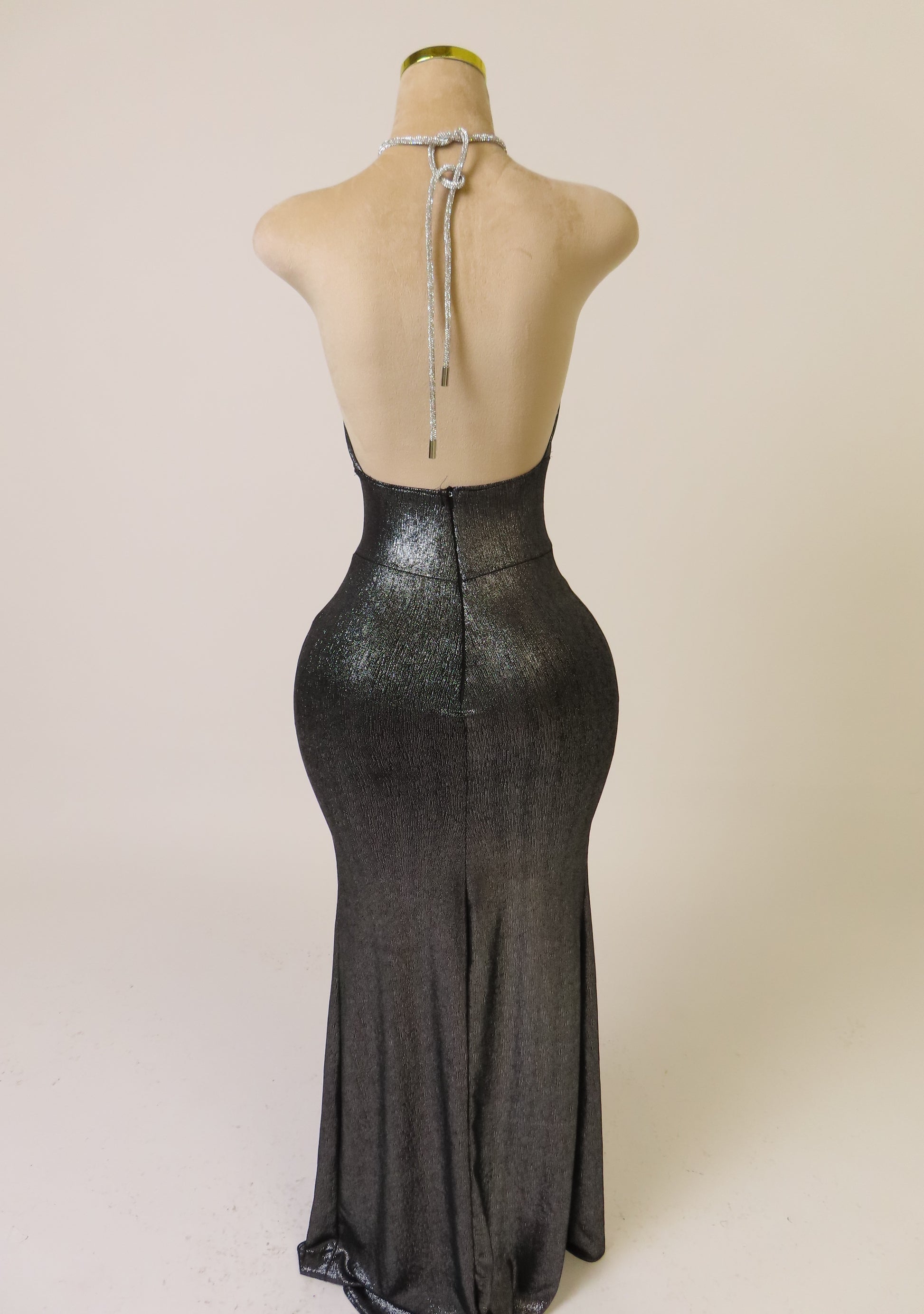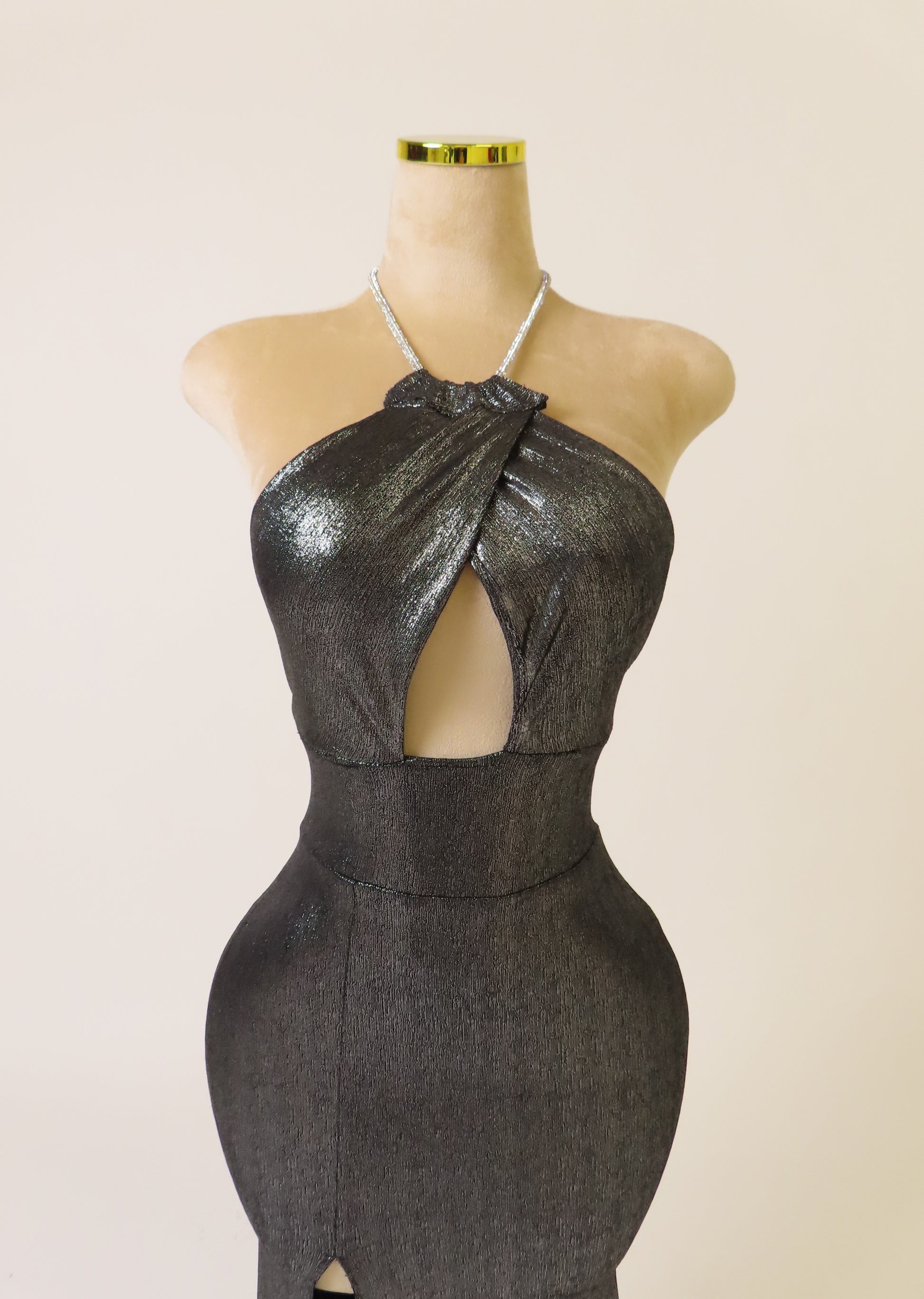 Capture the light and the energy of the night. Glister is the embodiment of after-dark luxury—playful, radiant, and unapologetically bold. With an open back and delicately revealed shoulders, this piece enhances the waist and creates a lengthened silhouette. A refined armour for the midnight hour.